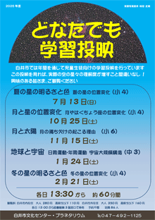 白井市では年間を通して児童生徒向けの学習投映を行っています。この投映を見れば、実際の空の星々の理解度が増すこと間違いなし!今年度は5種類の学習投映を下記日程で行います。昔、中学生だった大人でも、ON
