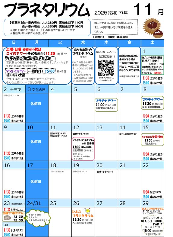 | 11月12日(水曜日) | 11時 にんさんぷラネタリウム with図書館 |