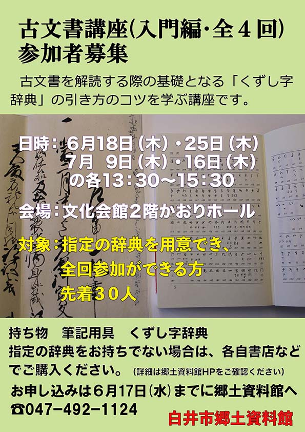申し込み 5月1日(金)~6月17日(水)までに 郷土資料館で直接または電話(047-492-1124)にて申し込み