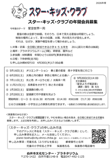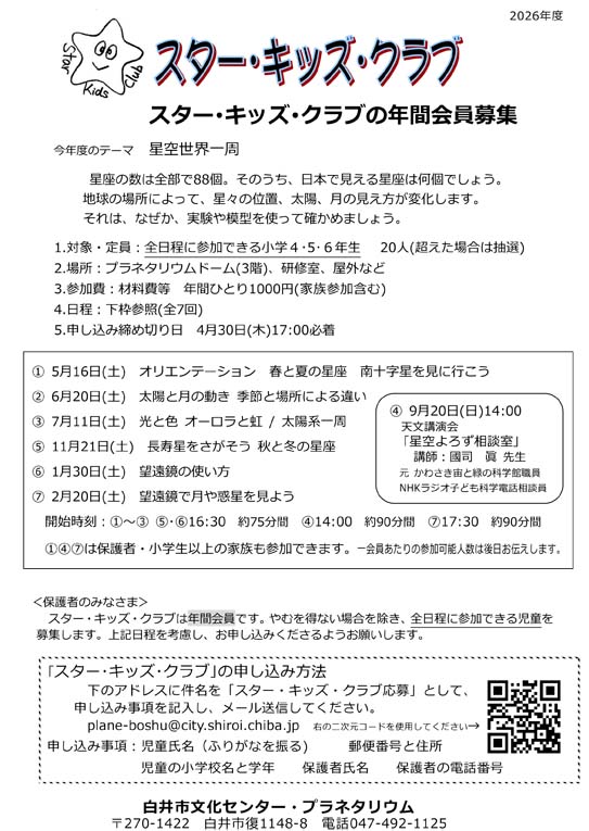 下記アドレスに件名を「スター・キッズ・クラブ応募」として、申し込み事項を記入し、メール送信してください。